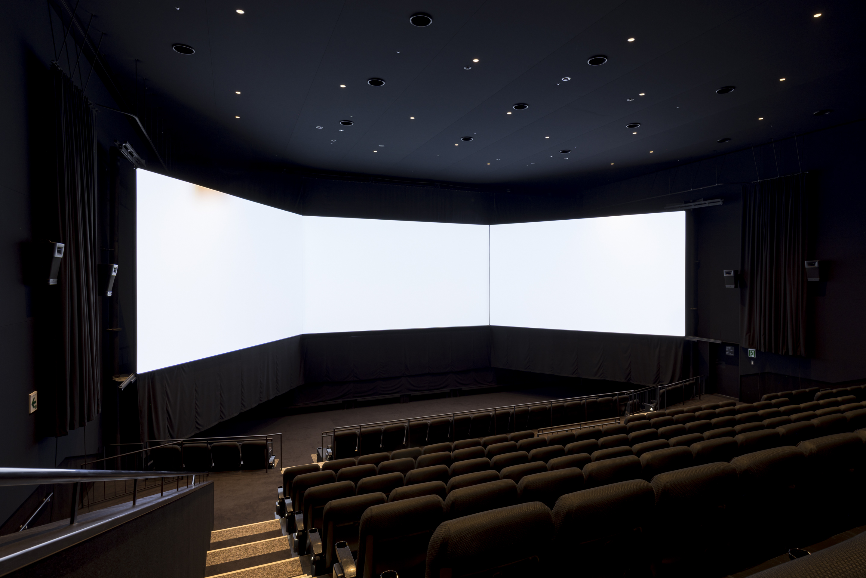 - 導入内容:映写・音響設備(DLP・サーバー・プロセッサー・アンプ・スピーカー・ スクリーン・幕・TMS)・3面スクリーン及び3面上映用機材